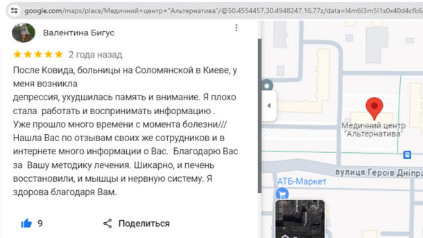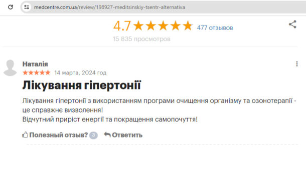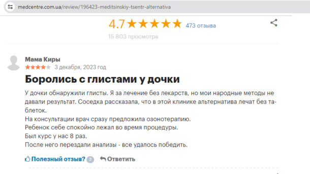 У доньки виявили глисти. Я за лікування без ліків, але мої народні методи не давали результату. Сусідка розповіла, що в цій клініці “Альтернатива” лікують без таблеток. На консультації лікар одразу запропонувала озонотерапію. Дитина собі спокійно лежала під час процедури. Був курс у нас 8 разів.