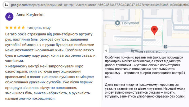 Багато років страждала від ревматоїдного артриту рук, постійний біль, ранкова скутість, запалення суглобів і обмеження в рухах буквально позбавляли мене можливості нормально жити. Особливо важко було в холодну пору року, коли загострення ставали частішими. У медичному центрі мені запропонували курс озонотерапії, який включав внутрішньовенні крапельниці із озоно-кисневою сумішшю та місцеве обколювання уражених суглобів.