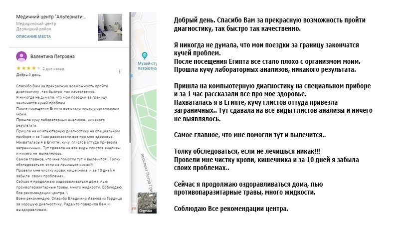 Провели мне чистку крови, кишечника и за 10 дней я забыла своих проблемах.. Сейчас я продолжаю оздоравливаться дома, пью противопаразитарные травы, много жидкости.