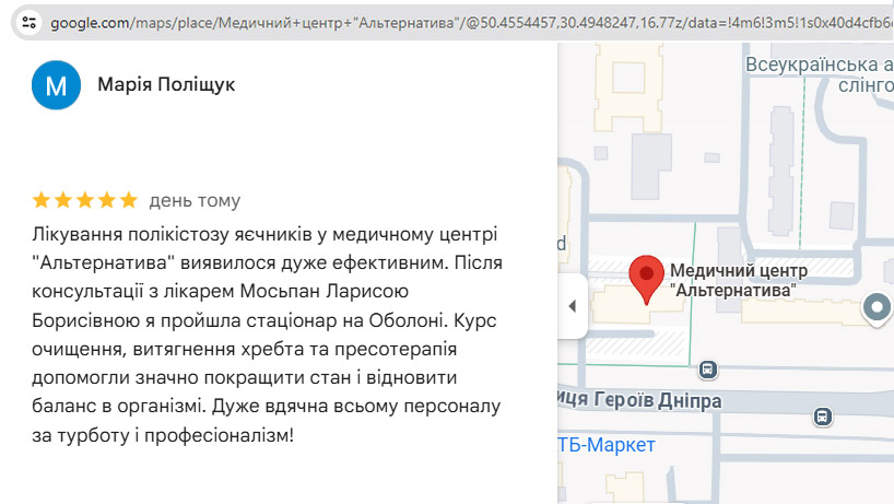 Лікування полікістозу яєчників у медичному центрі “Альтернатива” виявилося дуже ефективним, після консультації з лікарем Мосьпаном Ларисою Борисівною я пройшла стаціонар на Оболоні.