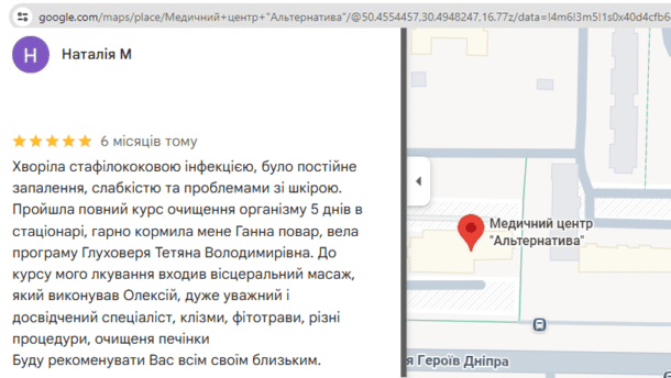 Болела стафилококковой инфекцией, было постоянное воспаление, слабостью и проблемами с кожей. Прошла полный курс очищения организма 5 дней в стационаре, хорошо кормила меня Анна повар, вела программу Глуховеря Татьяна Владимировна. В курс моего лечения входил висцеральный массаж, который выполнял Алексей, очень внимательный и опытный специалист, клизмы, фитотравы, различные процедуры, очищение печени.