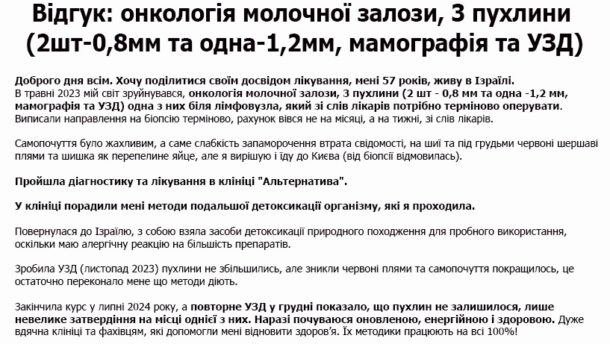 В травні 2023 мій світ зруйнувався, онкологія молочної залози, 3 пухлини (2 шт – 0,8 мм та одна -1,2 мм, мамографія та УЗД) одна з них біля лімфовузла, який зі слів лікарів потрібно терміново оперувати. Виписали направлення на біопсію терміново, рахунок вівся не на місяці, а на тижні, зі слів лікарів. Самопочуття було жахливим, а саме слабкість запаморочення втрата свідомості, на шиї та під грудьми червоні шершаві плями та шишка як перепелине яйце, але я вирішую і їду до Києва (від біопсії відмовилась).