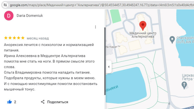 Анорексія лікується з психологом та нормалізацією харчування. Ірина Олексіївна у Медцентрі Альтернатива допомогла мені стати на ноги. У прямому значенні цього слова. Ольга Володимирівна допомогла налагодити їжу. Підібрала продукти, які потрібні у моєму меню. І за допомогою міостимуляції допомогли відновити тонус м’язів.