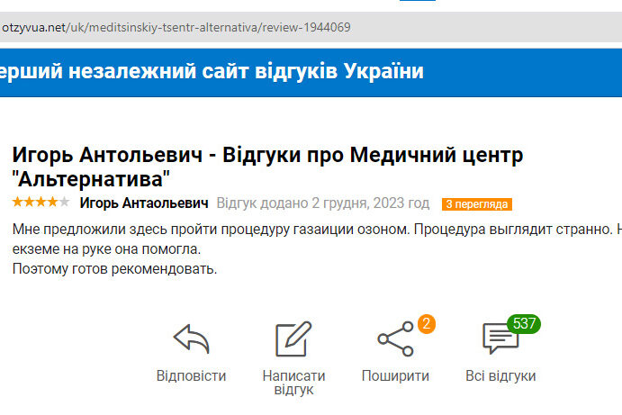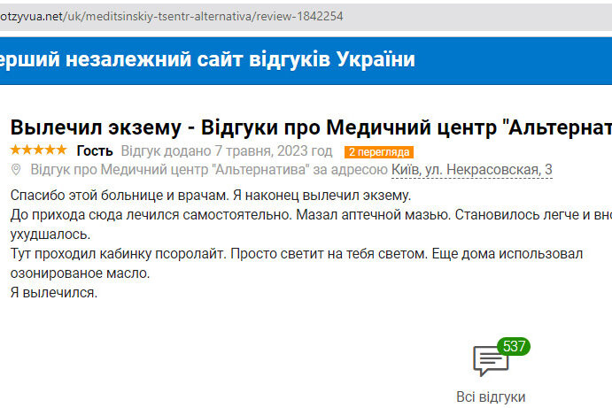 Звернувся в “Альтернативу” з важкою формою екземи. Лікарі провели обстеження і призначили комплексне лікування, включаючи озонотерапію і детоксикацію. Результат був просто приголомшливим – шкіра стала набагато кращою, і симптоми екземи практично зникли.