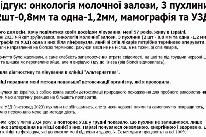 Для профілактики онкологічних захворювань у медичному центрі "Альтернатива" проводиться протипаразитарна програма, застосовується програма очищення організму в умовах стаціонарного центру/амбулаторно. Нормалізація роботи травного каналу, відновлення печінки, судин, лімфатичної системи, відновлення обміну речовин, нормалізація маси тіла.