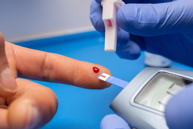 - Вимірювання глікованого гемоглобіну (HbA1c). Тест дає змогу оцінити середній рівень глюкози в крові за останні 2-3 місяці. Нормальний рівень HbA1c становить менше 5,7%. Рівень між 5,7% і 6,4% вказує на предіабетичний стан, а рівень 6,5% і вище – на діабет.