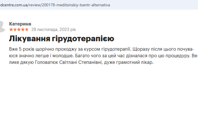 Після процедури минуло більше місяця, самопочуття хороше, тож можу сказати, що повністю задоволена, не дарма цей спосіб лікування використовують уже багато століть…