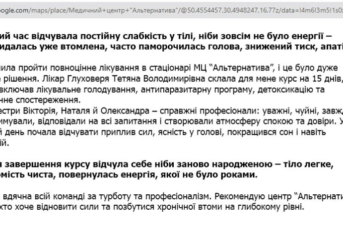 - Обстеження: консультації лікарів, УЗД органів черевної порожнини (печінка, жовчний міхур, жовчні протоки, підшлункова залоза, селезінка) і нирок, ЕКГ, визначення вірусів, бактерій, паразитів, дефіциту вітамінів і мікроелементів, харчової непереносимості на Комплексі Медичному Експертному, лабораторні аналізи