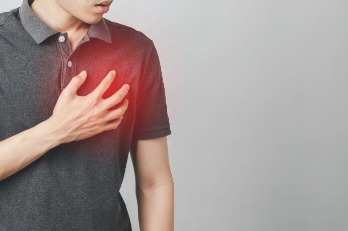 Найчастіше під час інфаркту виникає біль у лівій половині тулуба або за грудиною. Цей біль відчувається в лівій руці (можуть німіти пальці), лопатку або шию. Біль відчувається як гострий і пекучий, він не проходить у стані спокою. Потрібно пам’ятати що зустрічаються і безболісні форми інфаркту, наприклад у діабетиків, а також у випадку інфаркту, якщо він не торкнувся великі області серця. У такому разі інфаркт проявить себе задишкою чи порушенням ритму серця.