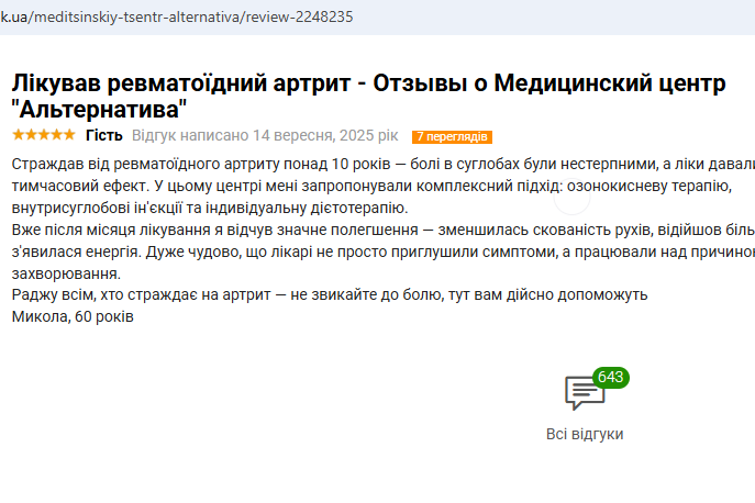 Врачи в Альтернативе проконсультировали, сказали, что это не зависит от возраста. Причиной осложнений функционирования суставов стала нагрузка на них – мой лишний вес. Я успешно справилась с этой проблемой, не пропускала ни один сеанс назначенных процедур, прошла здесь полное очищение организма, программу детоксикации и похудела.