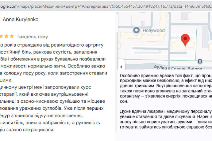 Біль у тазостегновому суглобі став з’являтися після будь-якої фізичної активності. Звернулася в центр, мені провели повний курс лікування, включно з детоксикацією та озонотерапією. Тепер я почуваюся набагато краще, біль зник, і я знову можу насолоджуватися життям. Величезне дякую лікарям за їхню працю!