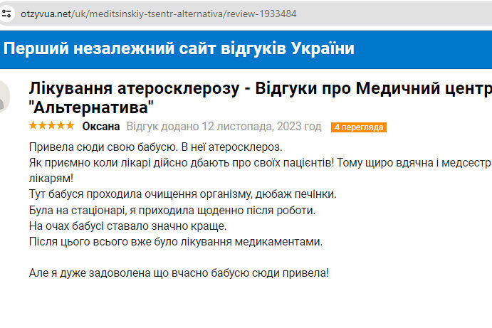 Потрапила до МЦ Альтернатива для відновлення організму оскільки було дуже багато супутніх хвороб,особливо із серцем.Після 10 денного очищення організм ніби відновився.Знизився тиск,пройшла страшна тахікардія…Озонотерапія вплинула на густоту крові.Дякую