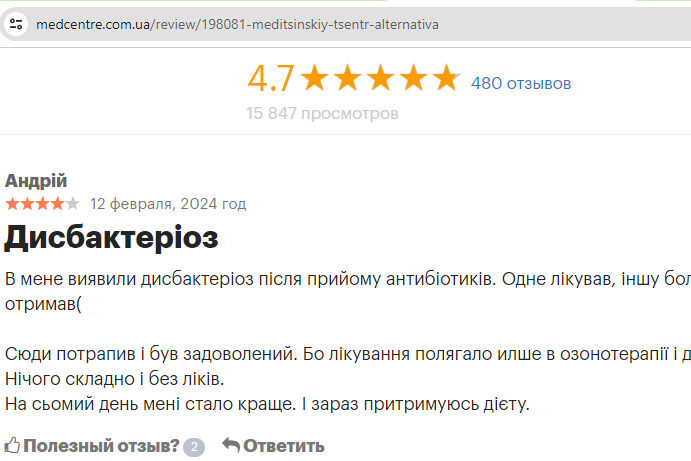 Для усунення дисбактеріозу звернувся за консультацією сюди. Отримав докладні рекомендації по харчуванню, пройшов курс очищення організму, дуоденальне зондування жовчного міхура, а так само пройшов курс пресотерапії. Мені все сподобалося