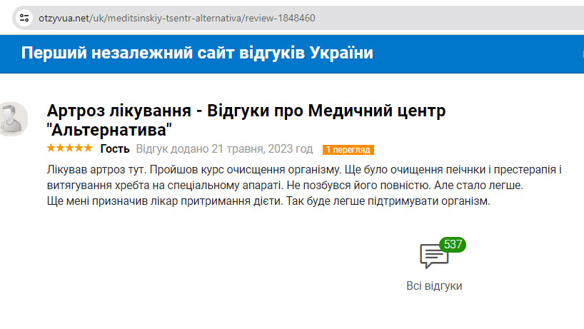 ДокладнішеЛікував артроз тут. Пройшов курс очищення організму. Ще було очищення пеічнки і пресотерапія і витягування хребта на спеціальному апараті. Не позбувся його повністю. Але стало легше. Ще мені призначив лікар притримання дієти. Так буде легше підтримувати організм.
