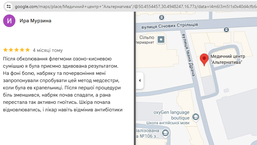 Відгук: після обколювання флегмони озоно-кисневою сумішшю біль зменшився, набряк почав спадати, а рана перестала так активно гноїтися