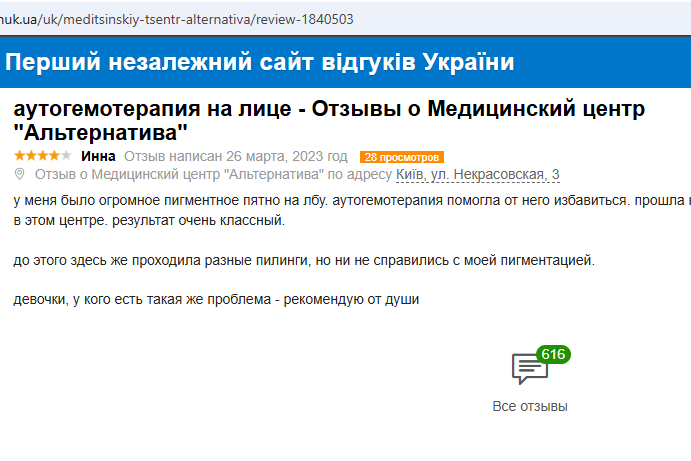 Уменя было огромное пигментное пятно на лбу. Аутогемотерапия помогла от него избавиться. Прошла курсом в этом центре. Результат очень классный.