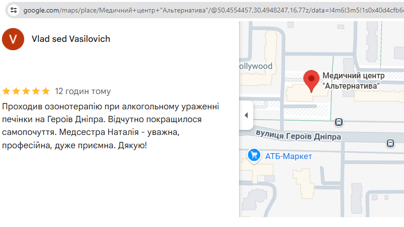 Проходил озонотерапию при алкогольном поражении печени Героев Днепра. Ощутимо улучшилось самочувствие. Медсестра Наталья – внимательная, профессиональная, очень приятная. Спасибо!