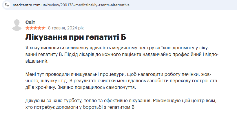Я хочу выразить огромную благодарность медицинскому центру за их помощь в лечении гепатита В.