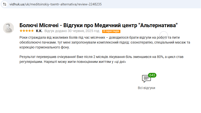 Результат превзошел ожидания! Уже через 2 месяца лечения боль уменьшилась на 80%, а цикл стал более регулярным. Наконец-то могу жить полноценной жизнью в «эти дни».