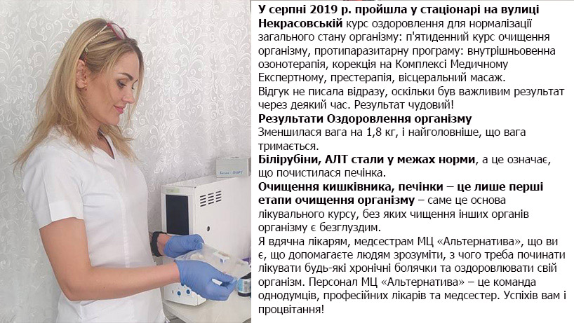 Я благодарна врачам, медсёстрам МЦ «Альтернатива», что Вы есть, что помогаете людям понять, с чего надо начинать лечить любые хронические заболевания и оздоровливать свой организм.