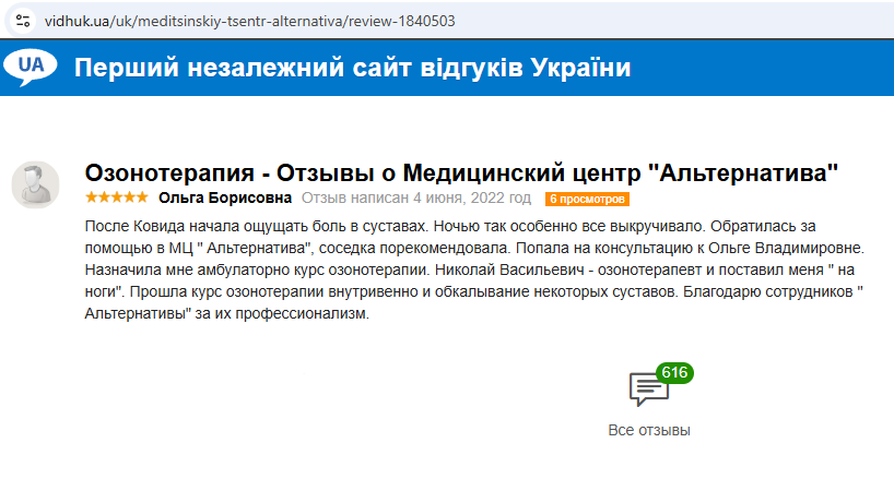 Опыт пациентов МЦ «Альтернатива» показывает, что правильно подобранный курс внутривенной озонотерапии и обкалывания суставов озоно-кислородной смесью помогает вернуться к активной жизни и забыть о постоянной боли.