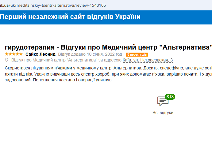 Воспользовался лечением пиявками в медицинском центре “Альтернатива”.