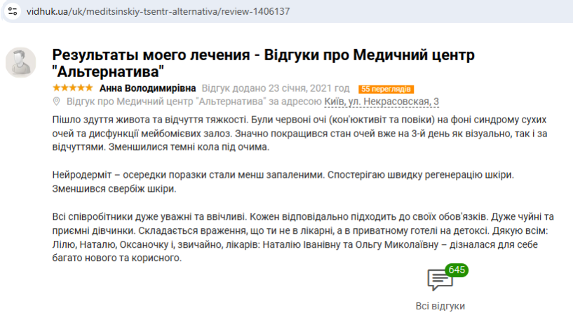 Все сотрудники очень внимательные и обходительные. Каждый ответственно подходит к своим обязанностям. Очень отзывчивые и приятные девочки. Создается впечатление, что ты не в больнице, а в частном «отеле» на детоксе. Благодарю всех: Лилю, Наташеньку, Оксаночку и, конечно, врачей: Наталью Ивановну и Ольгу Николаевну – узнала для себя много нового и полезного.
