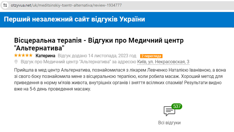 Пришла в мед центр Альтернатива, познакомилась с врачом Левченко Натальей Ивановной, а она со своей стороны познакомила меня с висцеральной терапией, когда делала массаж.
