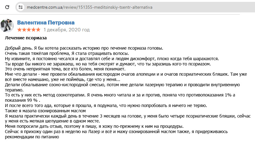 Отзыв: У меня псориаз на ногах. Проводили мне газацию в пластиковом мешке озоно-кислородной смесью