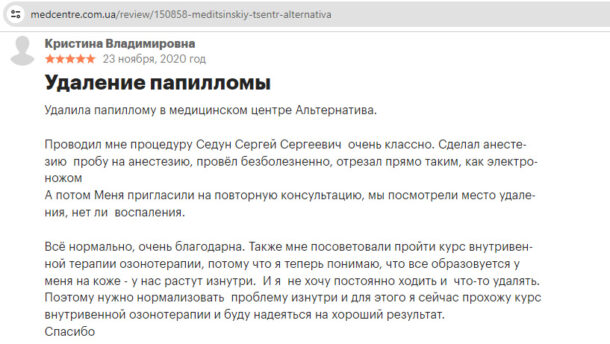 Отзывы: удалила папиллому, лечила папилломавирус с применением озонотерапии Удалила папиллому в медицинском центре Альтернатива. Проводил мне процедуру Седун Сергей Сергеевич очень классно. Сделал анестезию пробу на анестезию, провёл безболезненно, отрезал прямо таким, как электроножем. А потом меня пригласили на повторную консультацию, мы посмотрели место удаления, нет ли воспаления. Всё нормально, очень благодарна. Также мне посоветовали…
