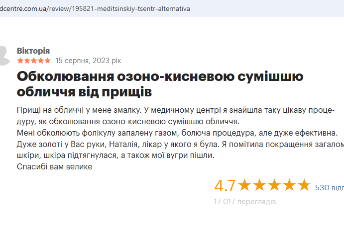 Вы можете оценить результативность данной косметологической процедуры в медицинском центре «Альтернатива» в Киеве. Она является абсолютно безболезненной и проводится при помощи специального аппарата. Ультразвуковая чистка также способствует своеобразному массажу клеток, что приводит к улучшению кровоснабжения в обрабатываемом участке. Сплошные плюсы от такой простой процедуры!