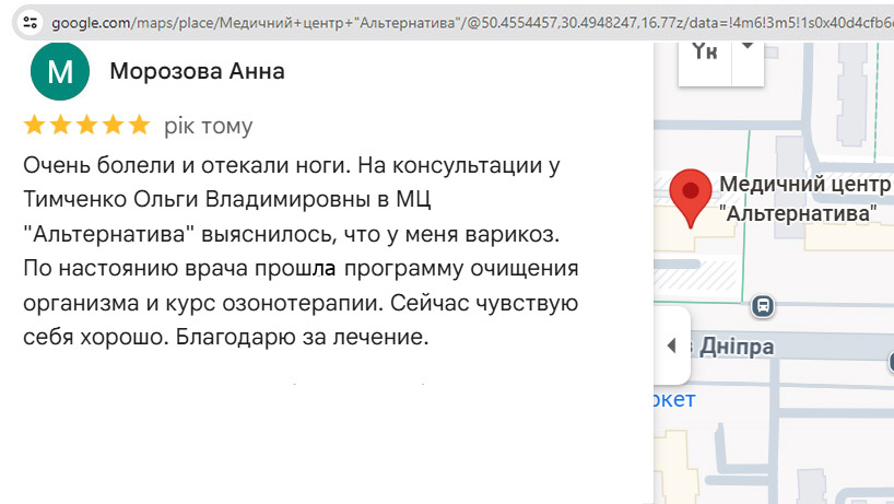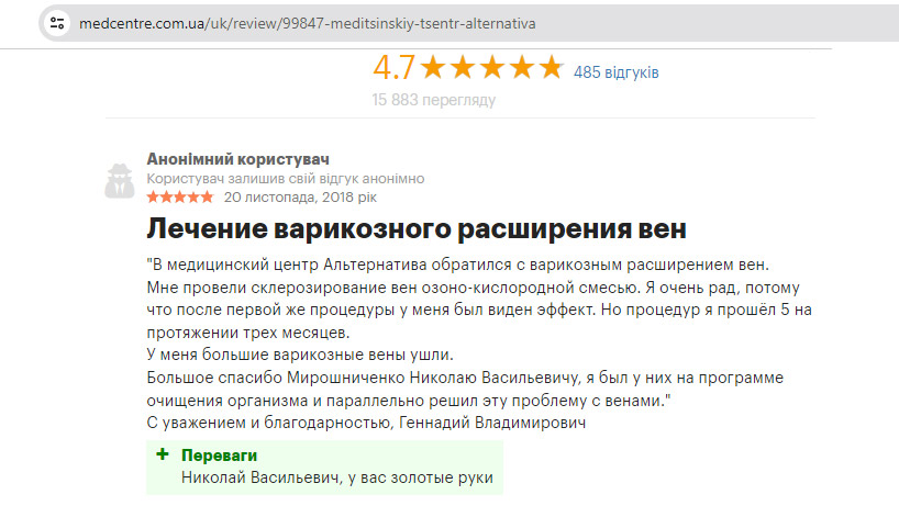 Отзыв пациента: Склерозирование поверхностных варикозно-расширенных вен озонированным физраствором