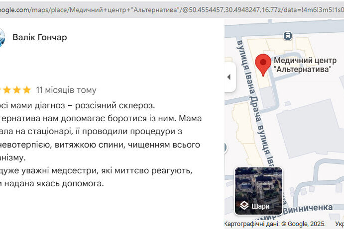 Лікування розсіяного склерозу потребує комплексного, індивідуального підходу. У медичному центрі «Альтернатива» створено всі умови для цього: сучасне обладнання, кваліфіковані лікарі, програми озонотерапії, детоксикації та психоемоційної підтримки.