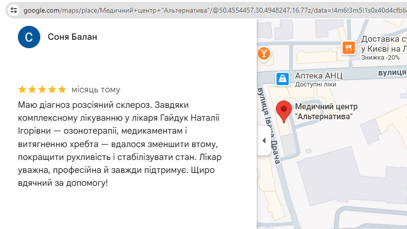 Поєднання тракційної терапії, озонотерапії, детоксикації та психоемоційної підтримки у медичному центрі «Альтернатива» дає змогу досягти помітного покращення навіть при хронічних формах розсіяного склерозу, коли звичайні методи не приносять достатнього ефекту.