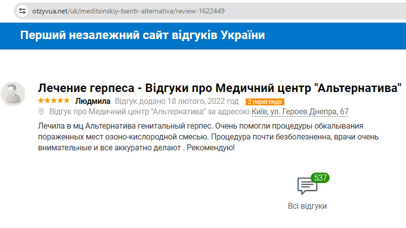 - Внутрішньовенна озонотерапія: введення озонованого фізіологічного розчину натрію хлориду, процедура великої аутогемоозонотерапії. Процедури мають пряму противірусну дію. Озоніди зі струмом крові розносяться по всьому організму, проникають у клітину, припиняючи процес реплікації вірусів, тобто здатність вірусів до самовідтворення.