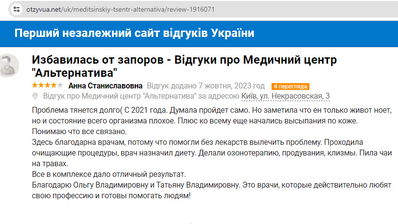 Відгук: лікування хронічного закрепу – детоксикація, озонотерапія