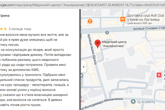 Ходила на консультацію до лікаря, який просто розвів руками та відправив додому. Потім випадково у метро побачила рекламу цього медичного центру і за порадою.Провели скринінг за допомогою Комплексу Медичного Експертного, проконсультувалися у трихолога.