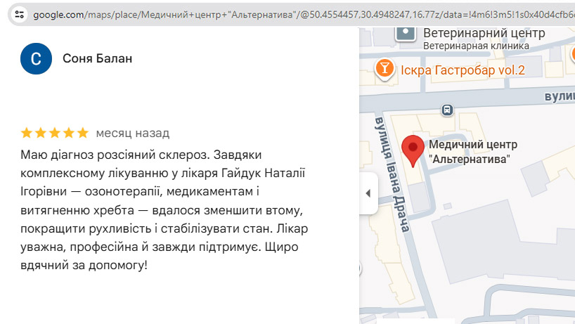 Завдяки комплексному лікуванню у лікаря Гайдук Наталії Ігорівни – озонотерапії, медикаментам і витягненню хребта — вдалося зменшити втому, покращити рухливість і стабілізувати стан.