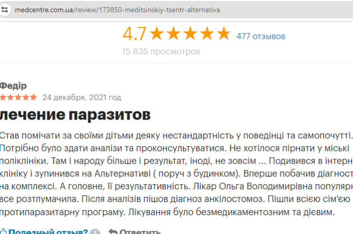 Відгук мами про лікування від глистів у дитини із застосуванням озонотерапії в медичному центрі “Альтернатива”: