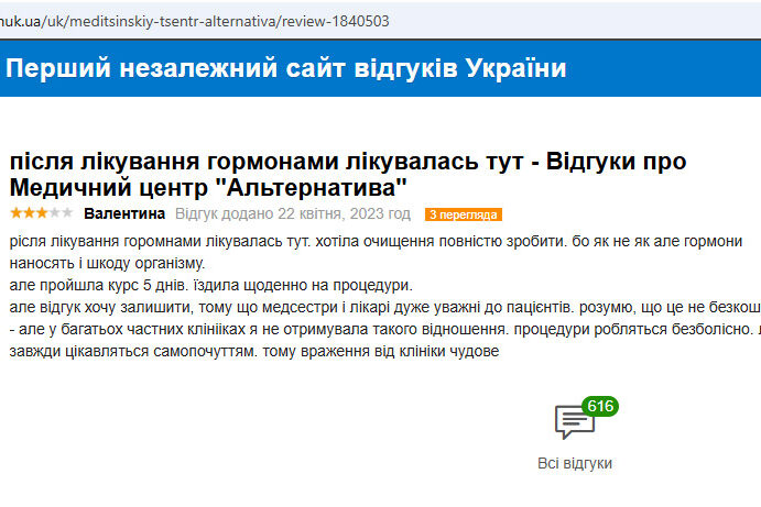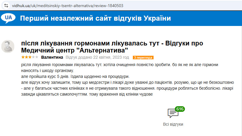 Після лікування гормонами лікувалася тут. Хотіла очищення повністю зробити, оскільки гормони завдають шкоди організму.