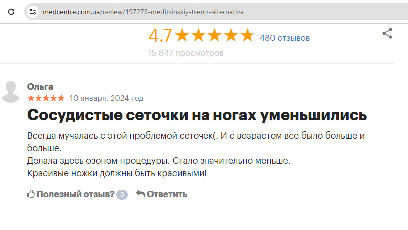 Відгук пацієнта медичного центру «Альтернатива» про те, як зменшити судинні сіточки на ногах