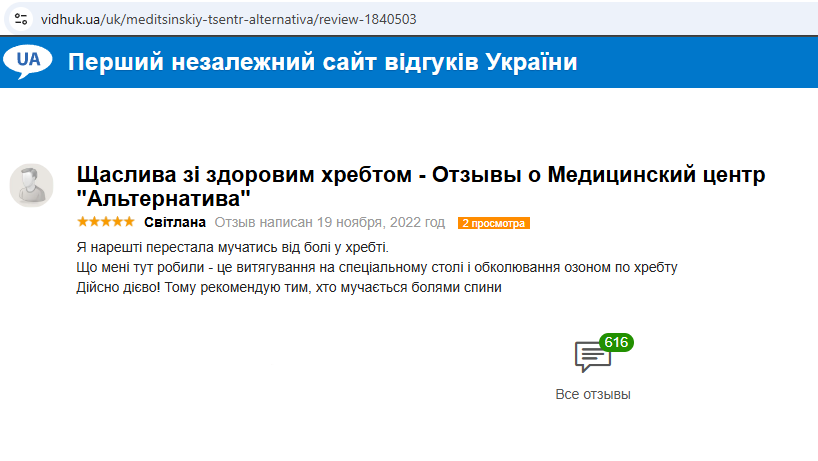 Відгук – апаратне витягнення хребта з обколюванням озоно-кисневою сумішшю при болі в хребті
