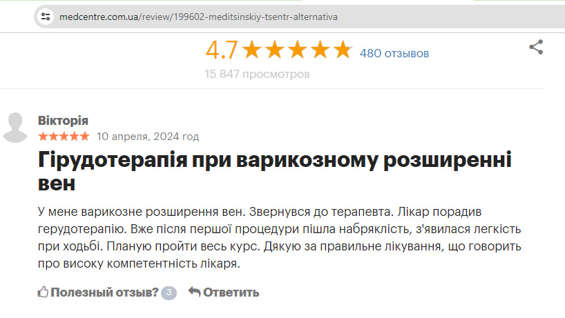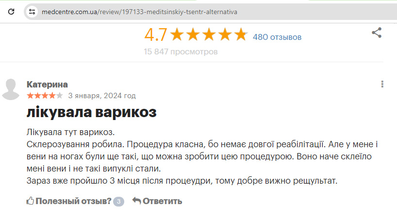 Відгук пацієнта: Склерозування поверхневих варикозно-розширених вен озонованим фізрозчином