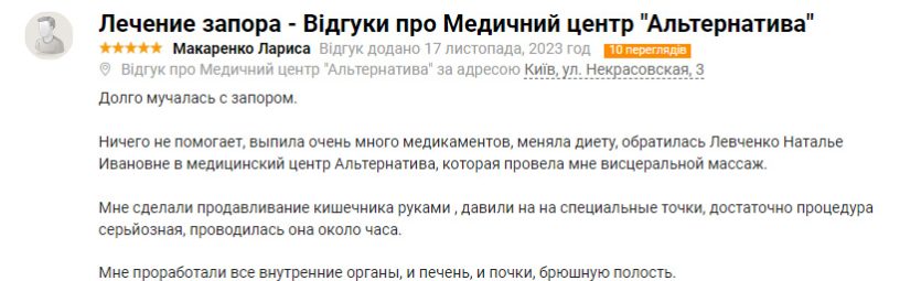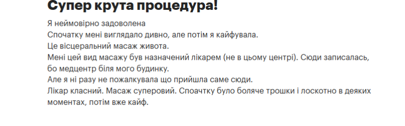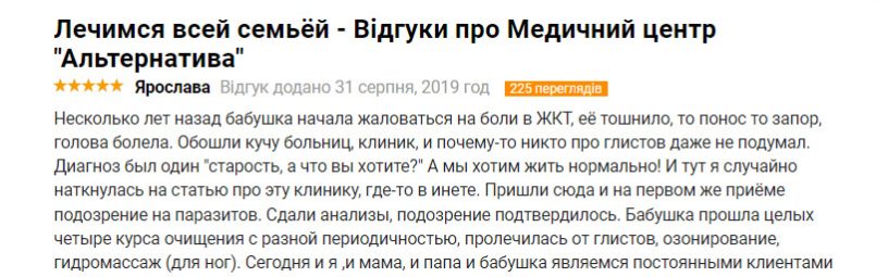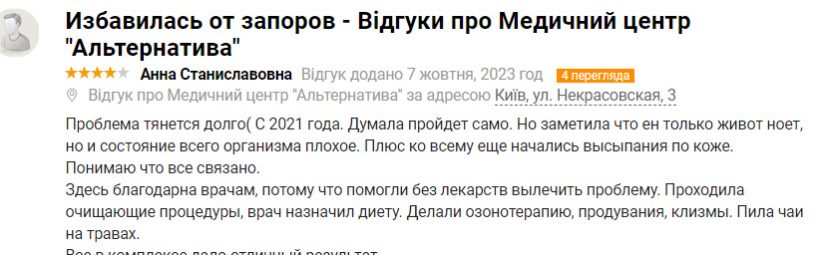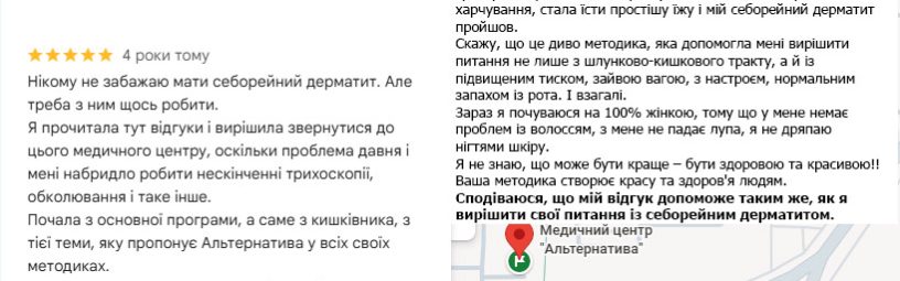 Коли я потрапила на консультацію до лікаря Глуховере, перше запитання, яке вона мені поставила: “”Чи є у мене закреп? “”. Я дуже здивувалась такому питанню, бо ніколи не пов’язувала свій себорейний дерматит із запором, який у мене вже 3 роки. Так ось, за підсумком, я опинилася на програмі стаціонарного лікування. Скажу, що це диво методика, яка допомогла мені вирішити питання не лише з шлунково-кишкового тракту, а й із підвищеним тиском, зайвою вагою, з настроєм, нормальним запахом із рота. І взагалі.