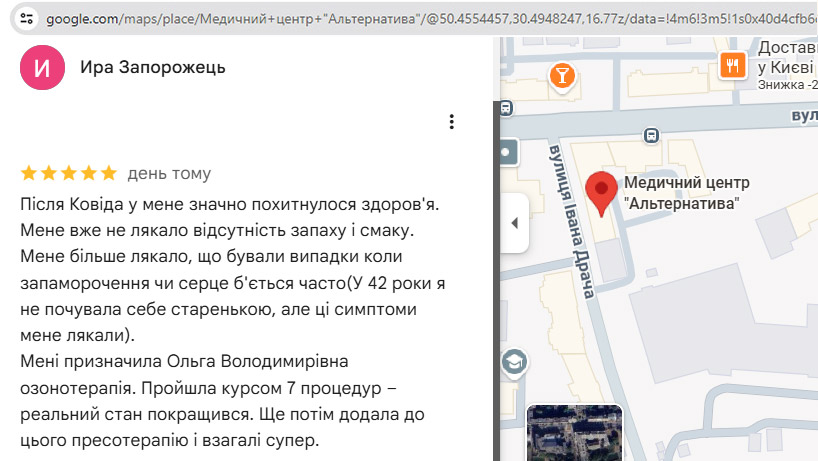 Відгук пацієнта про відновлення організму після covid-19 у медичному центрі “Альтернатива”. Після Ковіду, лікарні на Солом’янській у Києві, у мене виникла депресія, погіршилася пам’ять і увага. Я погано стала працювати і сприймати інформацію. Уже минуло багато часу з моменту хвороби. Знайшла Вас за відгуками своїх же співробітників і в інтернеті багато інформації про Вас. Дякую Вам за Вашу методику лікування. Шикарно, і печінку відновили, і м’язи, і нервову систему. Я здорова завдяки Вам. Відновлювальна програма після COVID-19 у нашому стаціонарі призначена для комплексного відновлення організму. Програма включає в себе низку медичних процедур і терапій, спрямованих на поліпшення фізичного і психічного стану пацієнтів, які перенесли коронавірусну інфекцію.